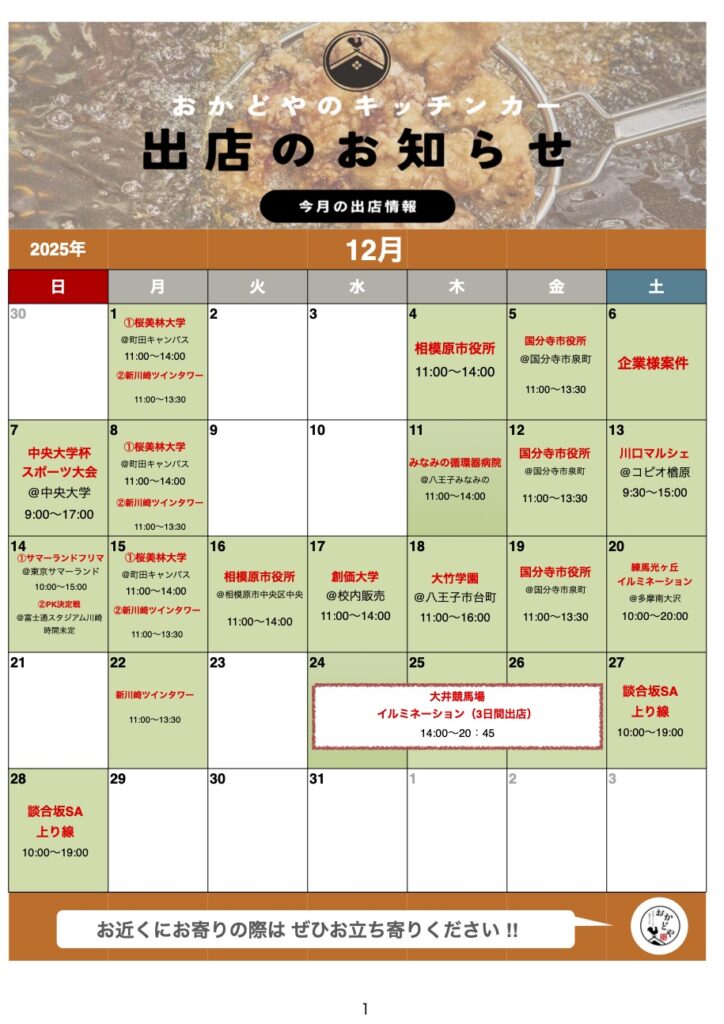 ホーム キッチンカー ◉12月出店予定*天候やトラブルにより急遽出店中止する事もございます。ご了承ください。 ◉2025年〜 キッチンカー出店風景 ▼横浜ビー・コルセアーズ ◉2024年〜 キッチンカー出店風景 ▼中村憲剛選手の引退試合出店(@川崎フロンパーク) ▼富士森花火大会 ▼八王子祭り